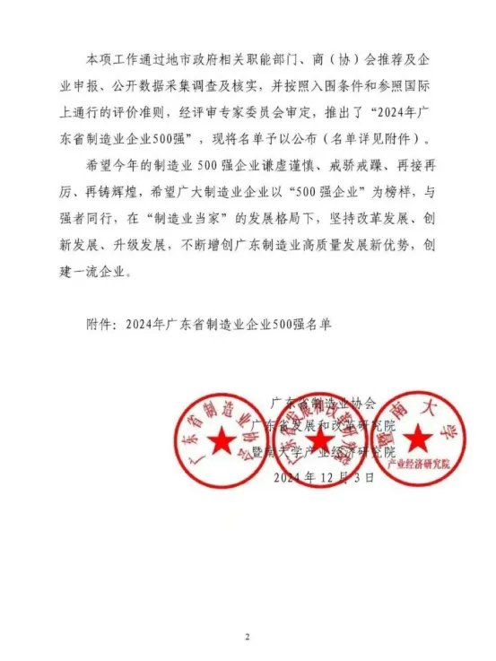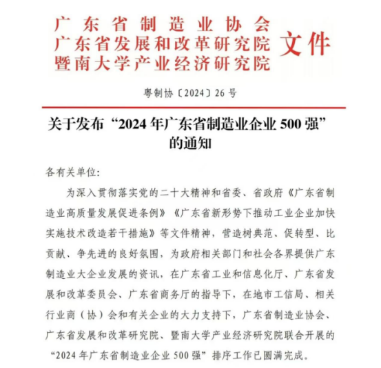 December 3, 2024 The "2024 Summit of Top 500 Manufacturing Enterprises in Guangdong Province and the Promotion Conference of Guangdong-Guangxi East-West Cooperation in Chongzuo, Guangxi" jointly hosted by the Guangdong Manufacturing Industry Association, the Guangdong Development and Reform Research Institute, the Institute of Industrial Economics of Jinan University, the United Front Work Department of the Guangxi Zhuang Autonomous Region Committee of the Communist Party of China, the Communist Party Committee of Chongzuo City, and the People's Government of Chongzuo City was successfully held in Guangzhou. And it released the list of the top 500 manufacturing enterprises in Guangdong Province in 2024.