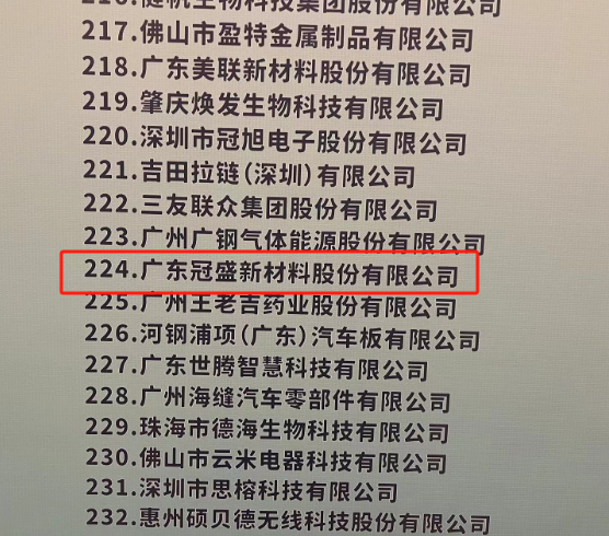 Guangdong Guansheng New Materials Co., Ltd. has once again made it to the 2024 list of the top 500 manufacturing enterprises in Guangdong Province, ranking 224th.